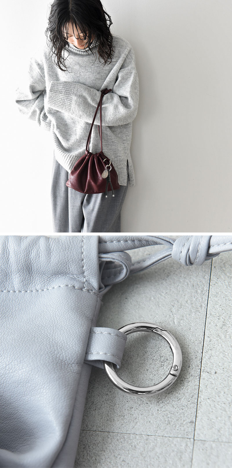 くたっと柔らかく手に馴染む、フェイクレザー素材の巾着ポーチ。バッグインバッグとして小物を整頓したり、トートバッグの目隠しにしたり。そのまま持って巾着バッグとしても使える上品な印象に仕上げました。