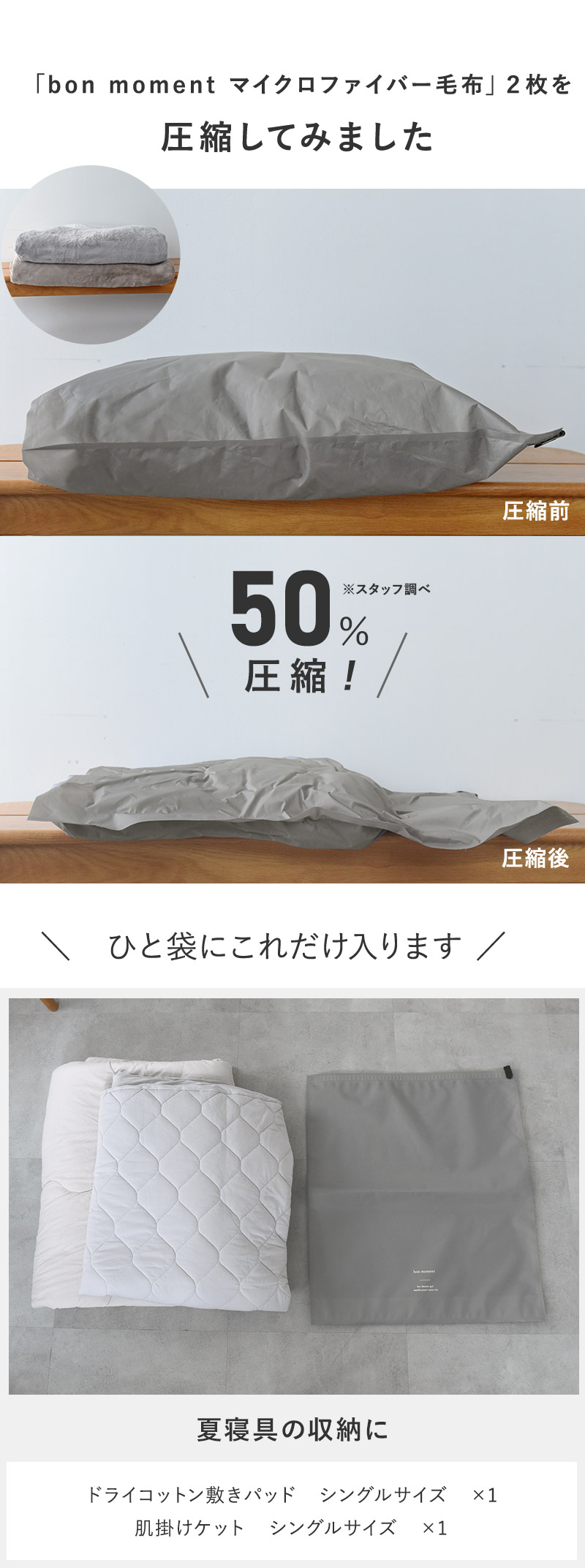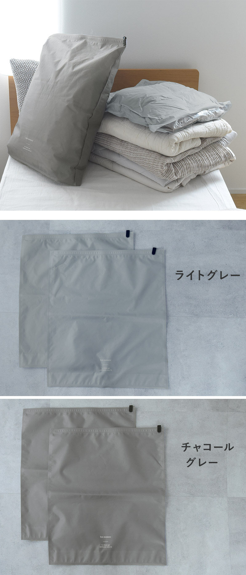 ライトグレーもしくは、チャコールグレーの2枚セット。どちらも主張は控えめ、インテリアから浮かないカラーリングです。衣類と寝具で使分けるのも◎。