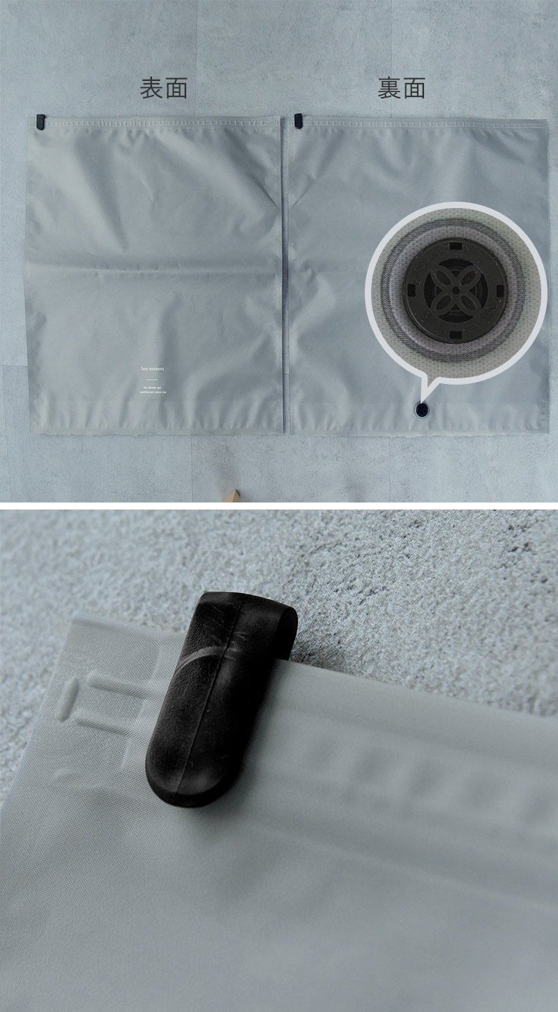 逆流防止のバブルで、空気の出入り口をしっかりロック。袋の口も、空気の侵入を防ぐダブルチャックになっています。