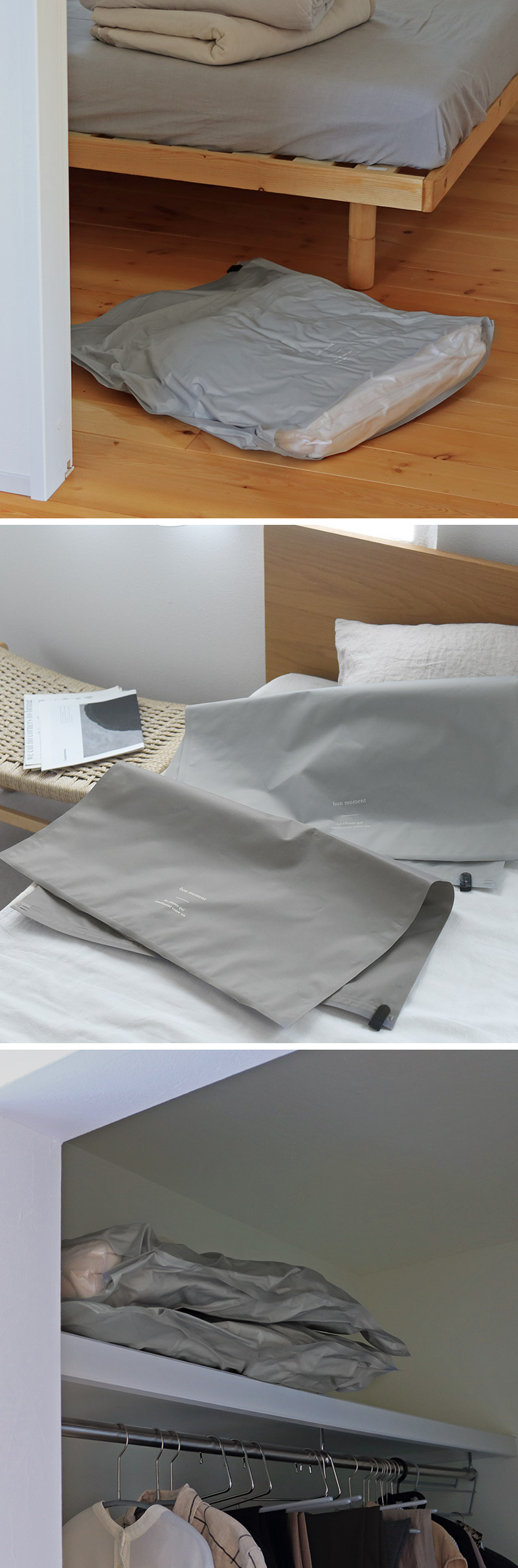 強い力を入れなくてもスムーズに空気が抜けて、ギュギュッと圧縮。抜群の圧縮力で空気がぬけてくる心配もなし。シーズンオフの寝具類もペタンコで収納しておけます。