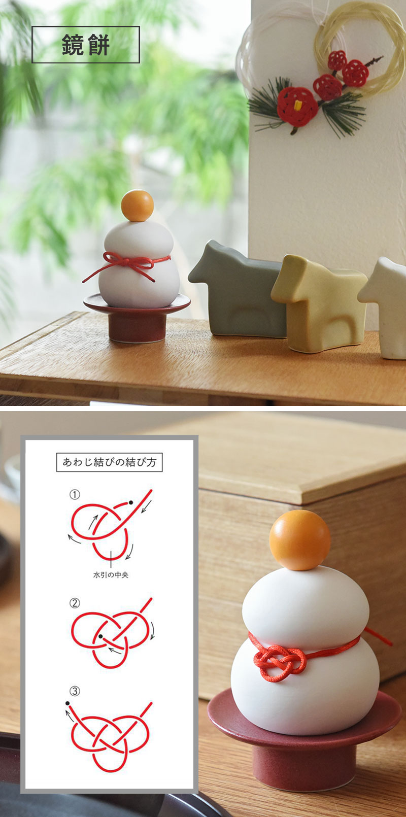 鏡餅として飾るなら、橙を乗せて、付属の紐をちょうちょ結び、またはあわじ結びにするとお正月らしく華やかに飾れます。