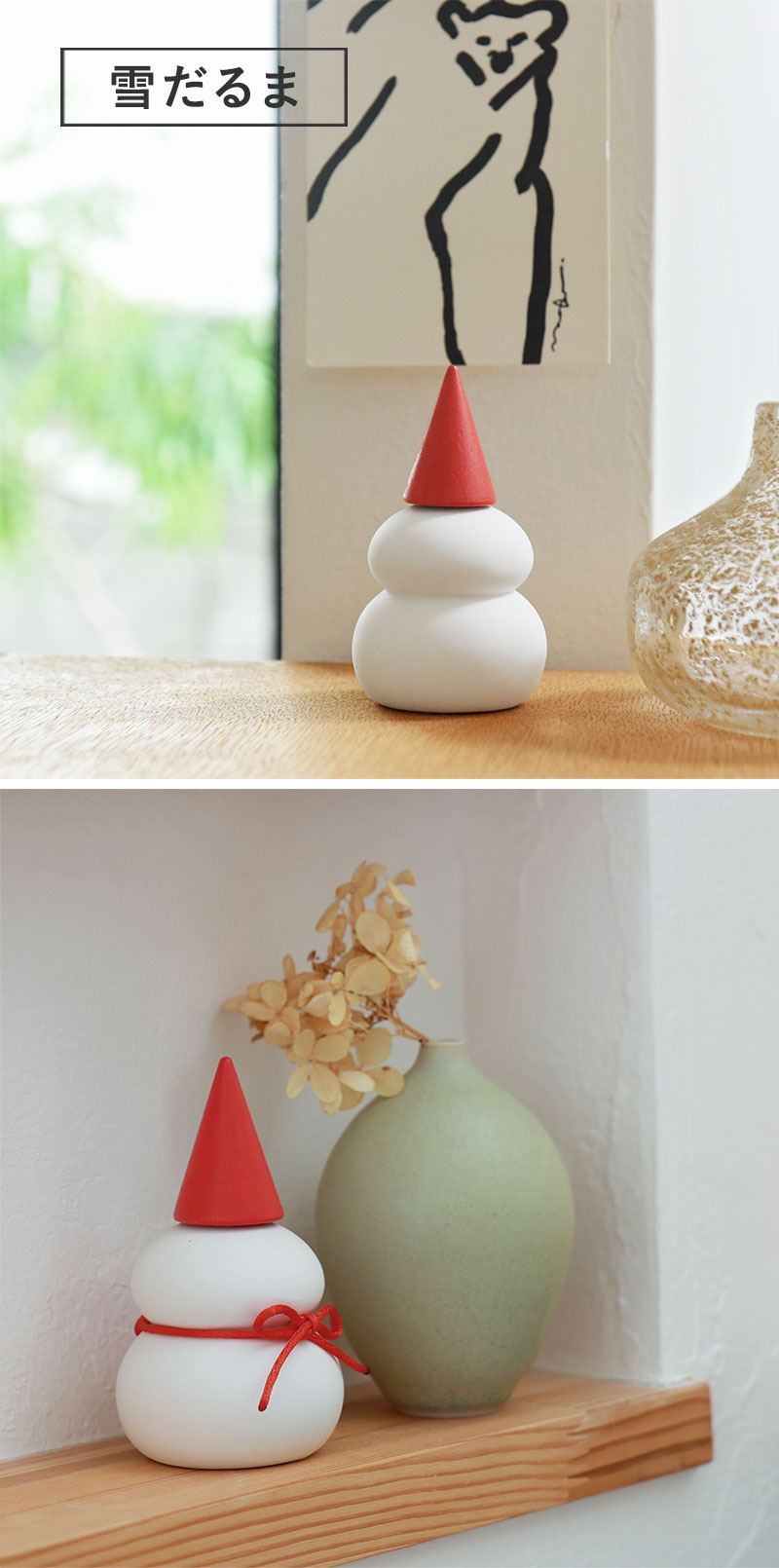 付属する「鏡餅、橙、帽子、飾り紐」を組み合わせれば、お正月は鏡餅、クリスマスなど冬の間は雪だるまとして飾っていただけます。