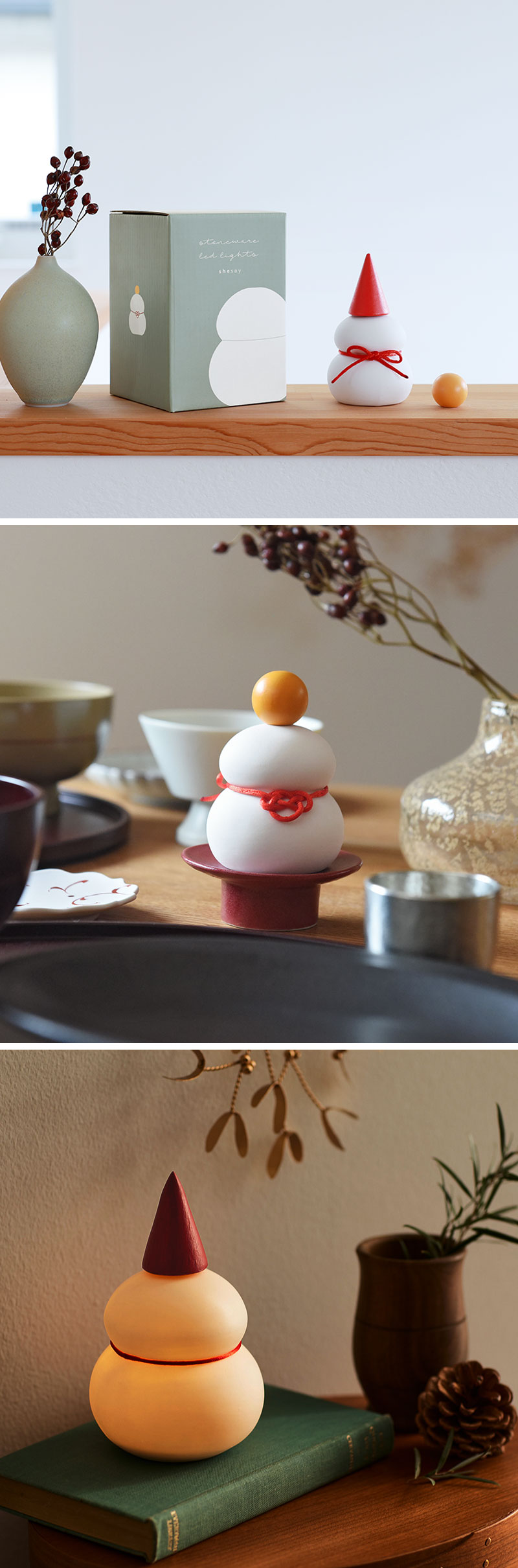 - 付属の橙と帽子、飾り紐の組み合わせ次第で、雪だるまにも鏡餅にもなるお飾りです。LEDライトが内蔵されているので、間接照明としても楽しめます。