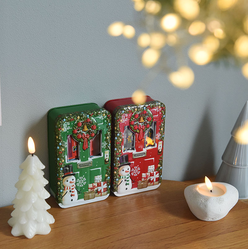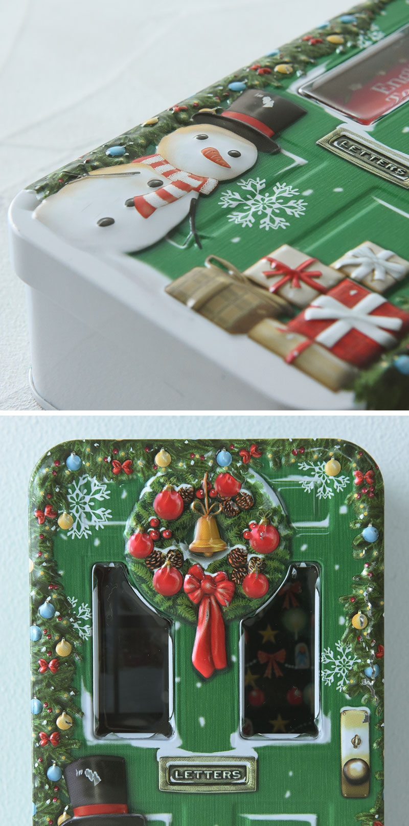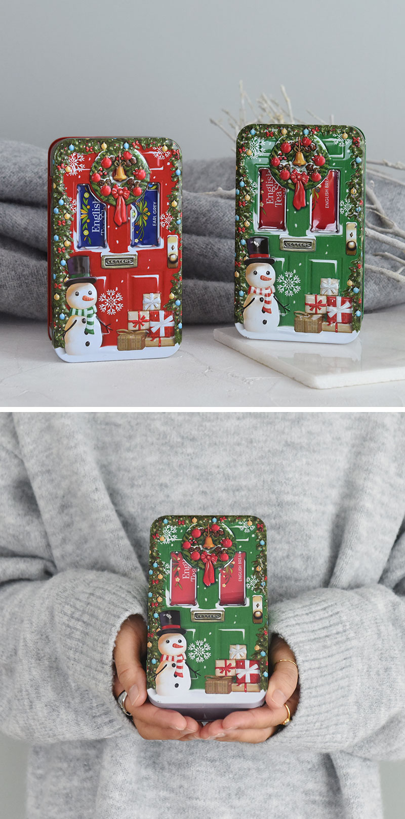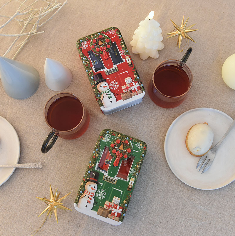 深いグリーンや赤が映える、クラシカルで愛らしい紅茶缶。エンボス加工によりクリスマスリースやギフトボックス、雪だるまが立体的に描かれています。