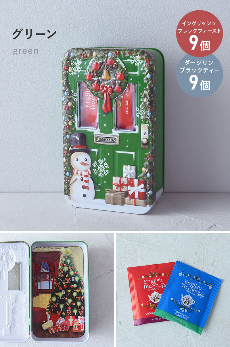 イングリッシュブレックファーストとダージリンブラックティーの2種、18袋入り。缶の底面には大きなクリスマスツリーが飾られたリビングルームが描かれています。