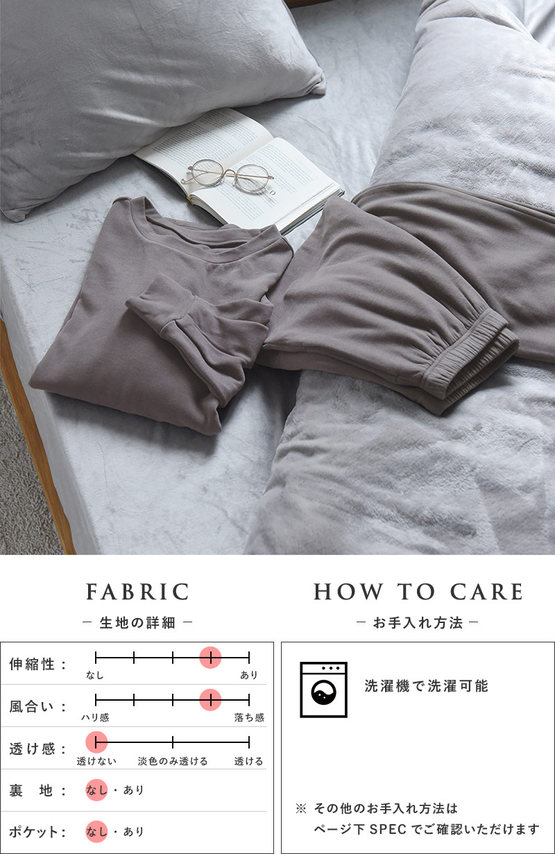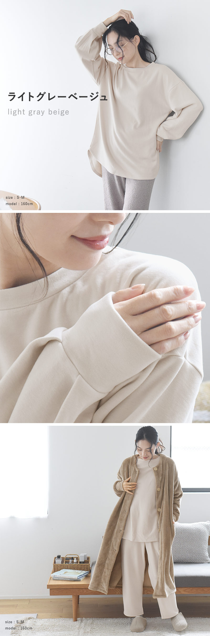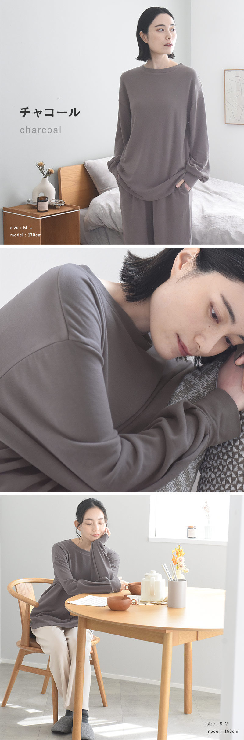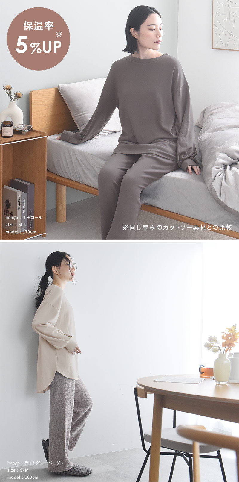 - ふんわり柔らく暖かいリラックスウェア。しっとり柔らかな肌心地と、じんわり優しいぬくもり。肌ストレスのない着心地で、丸一日着ていたくなる冬のルームウェアです。