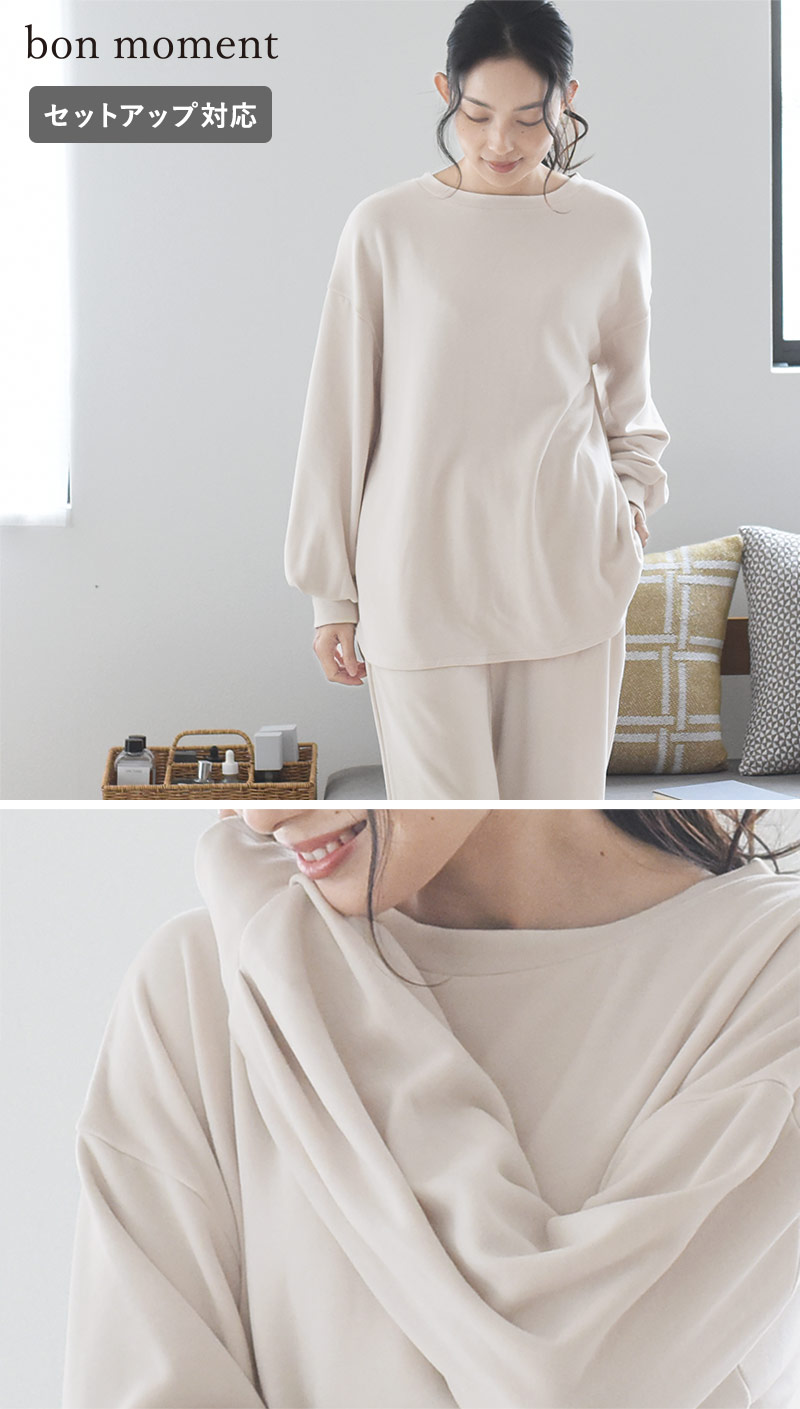 同素材のパンツとセットアップ使いも◎。同色で揃えるのも、あえて違う色であわせてもOK。ふんわりあたたかなウェアで上下を揃えればさらに心地よく過ごせそうです。