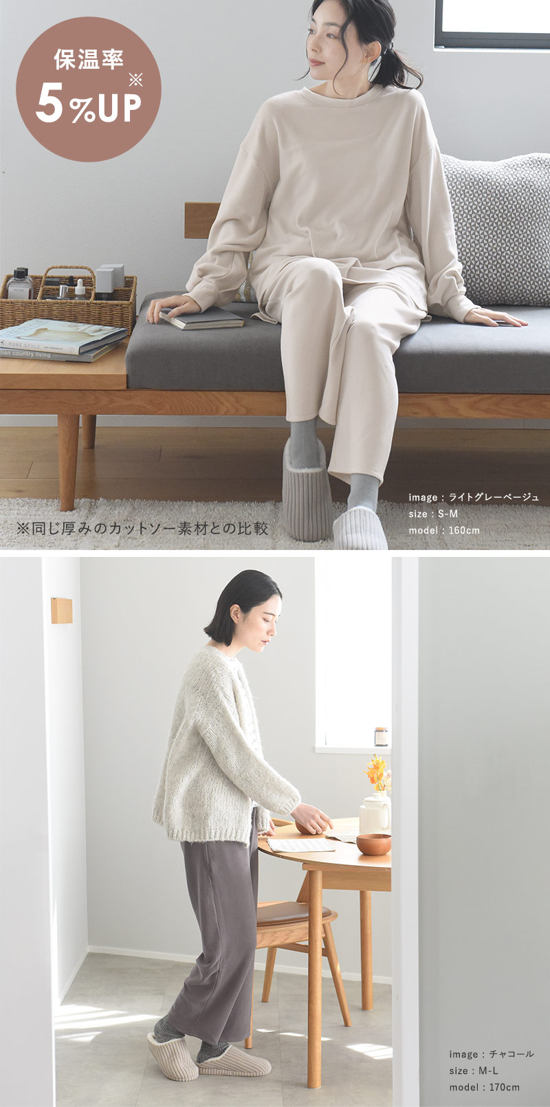 着心地が良いことはルームウェア選びで大切なポイント。こちらは、レーヨンがブレンドされていることでしっとり柔らかな肌心地。また、あたたかみのある微起毛素材で穏やかなぬくもりを感じます。