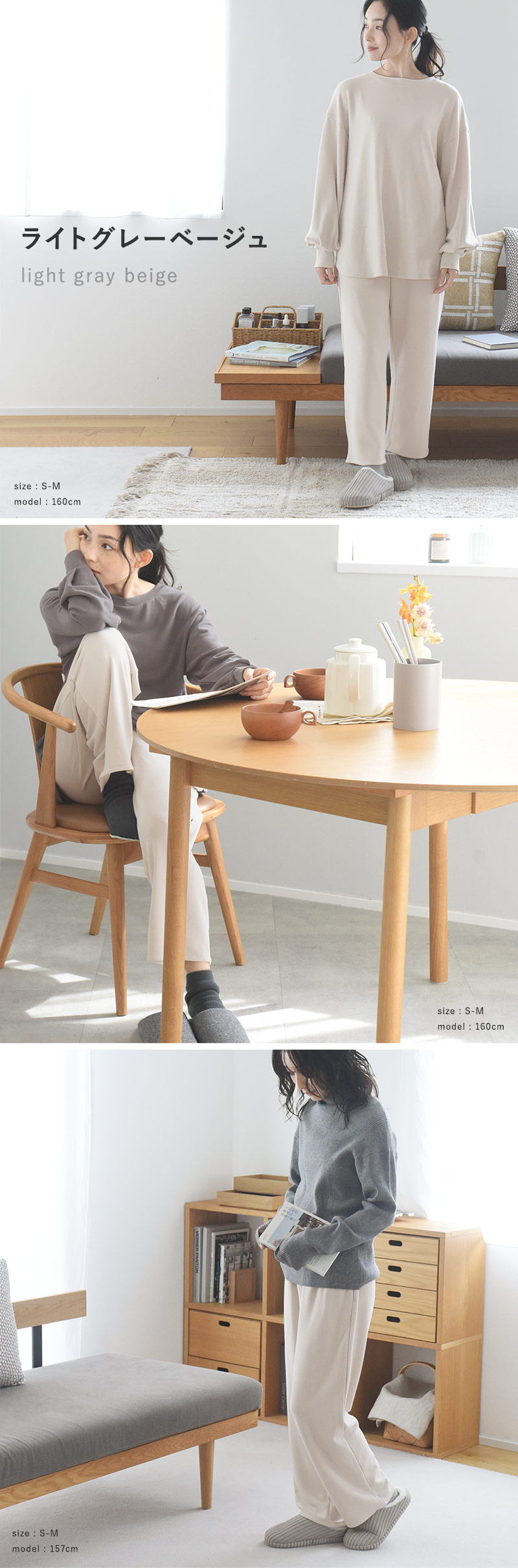 シンプルなルームウェアですが、着てみると実感するのはその着心地の良さ。ウールによく似たアクリル混素材で作られていることで、じんわりあたたかいのが特徴です。