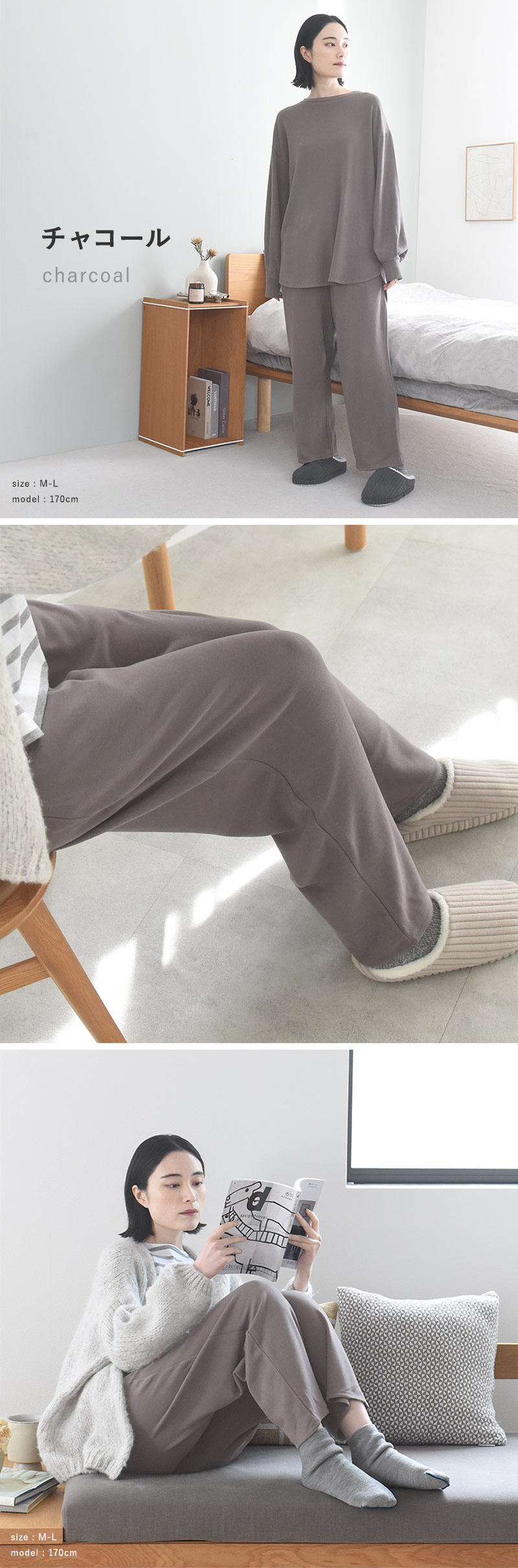 - ふんわり柔らく暖かいリラックスパンツ。しっとり柔らかな肌心地と、じんわり優しいぬくもり。肌ストレスのない着心地で、丸一日着ていたくなる冬のルームウェアです。