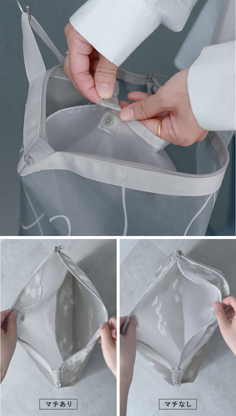 片側はマチあり、もう一方はマチなしの仕様になっているので、衣類の大きさによって分けることもできます。