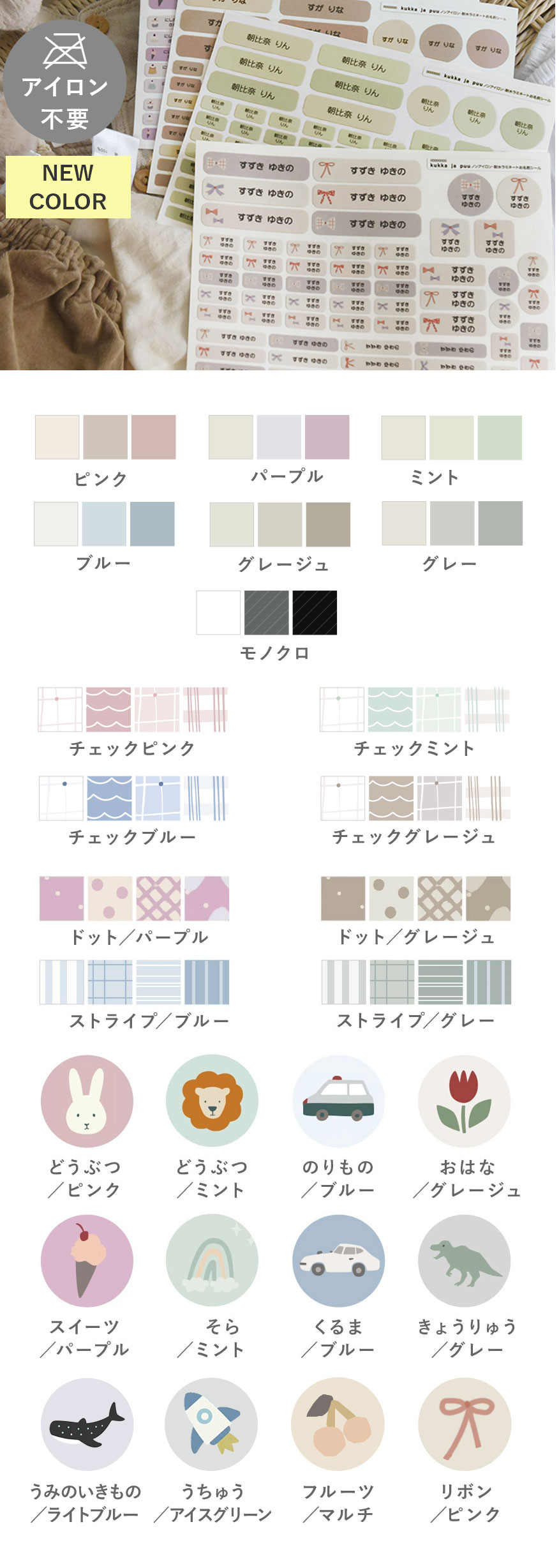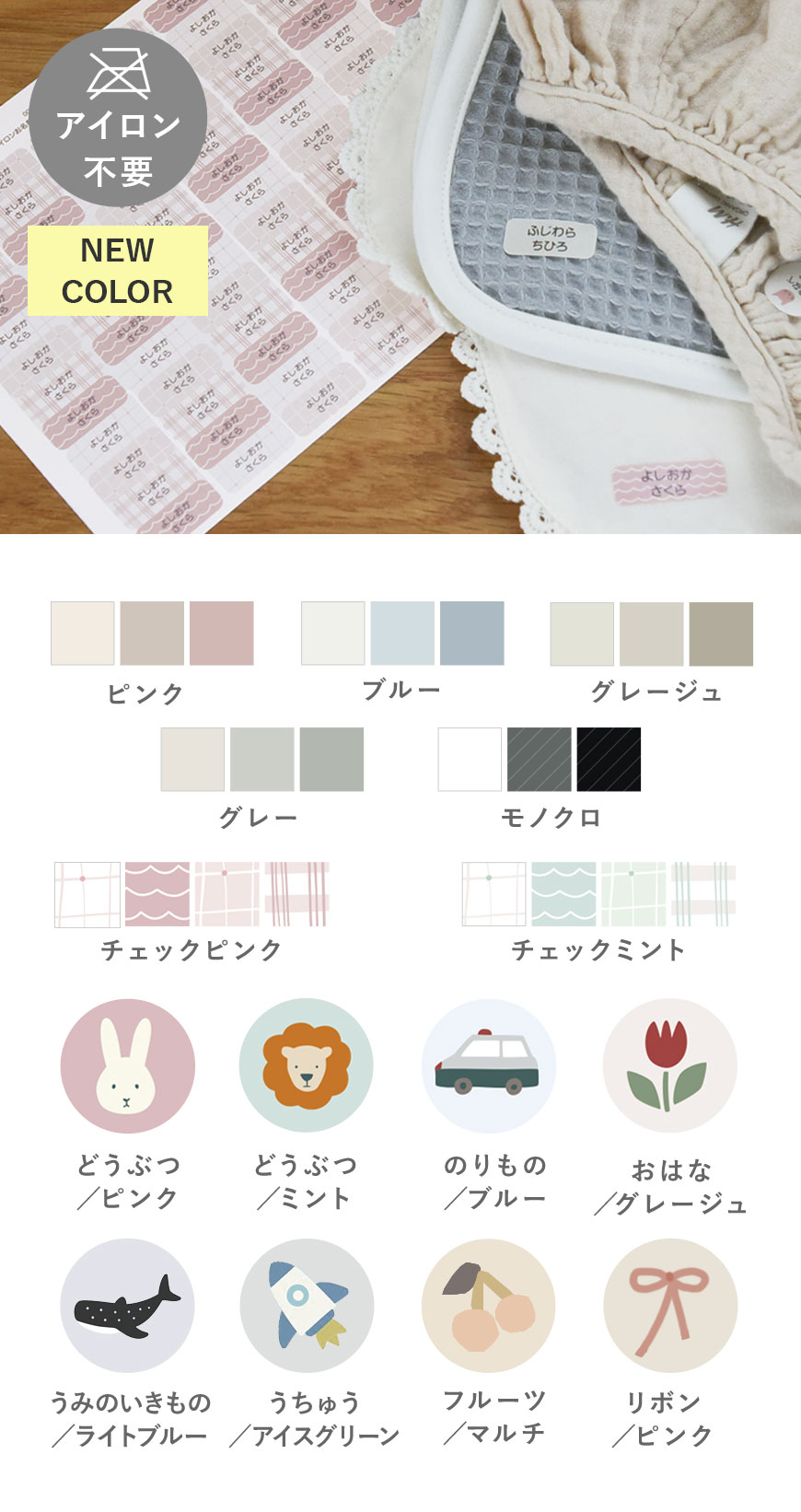 布にも貼れる強粘着タイプや、水にも強い定番シールタイプ、